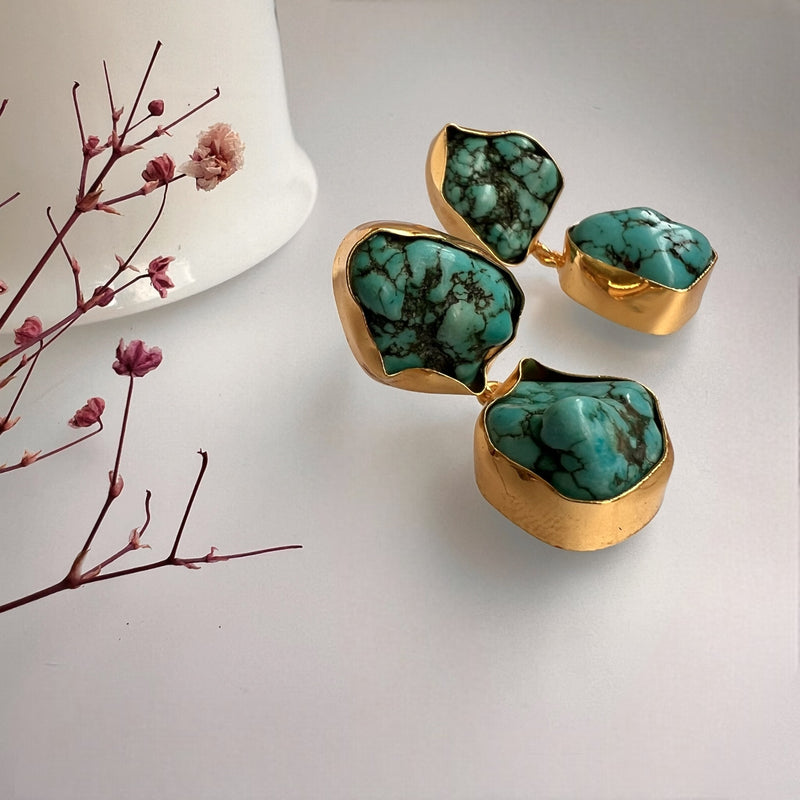 SHINORA GOLD TONED 18KT GP PLATING SEMI HANDMADE RAW STONE STUDS ER622