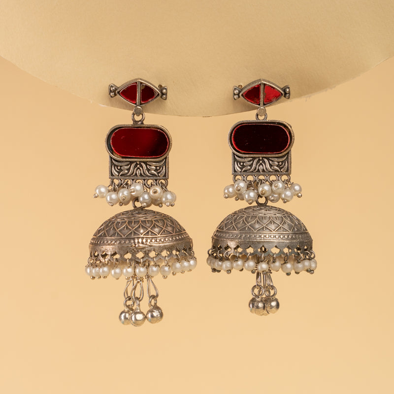 AZALIA SILVER LOOK ALIKE SEMI HANDMADE MIRROR JHUMKAS EARRINGS ER926