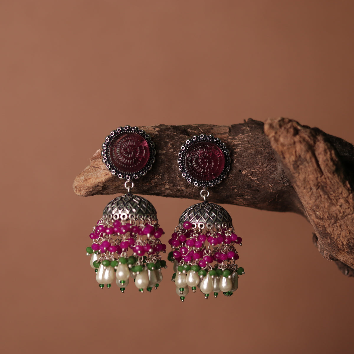 SPIRAL CARVING STONE SEMI HANDMADE BEADED JHUMKAS-ER113