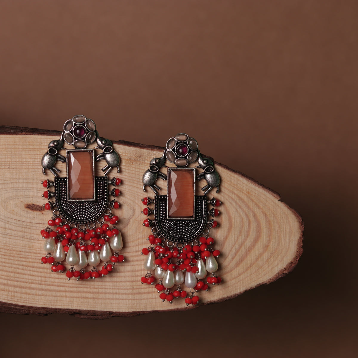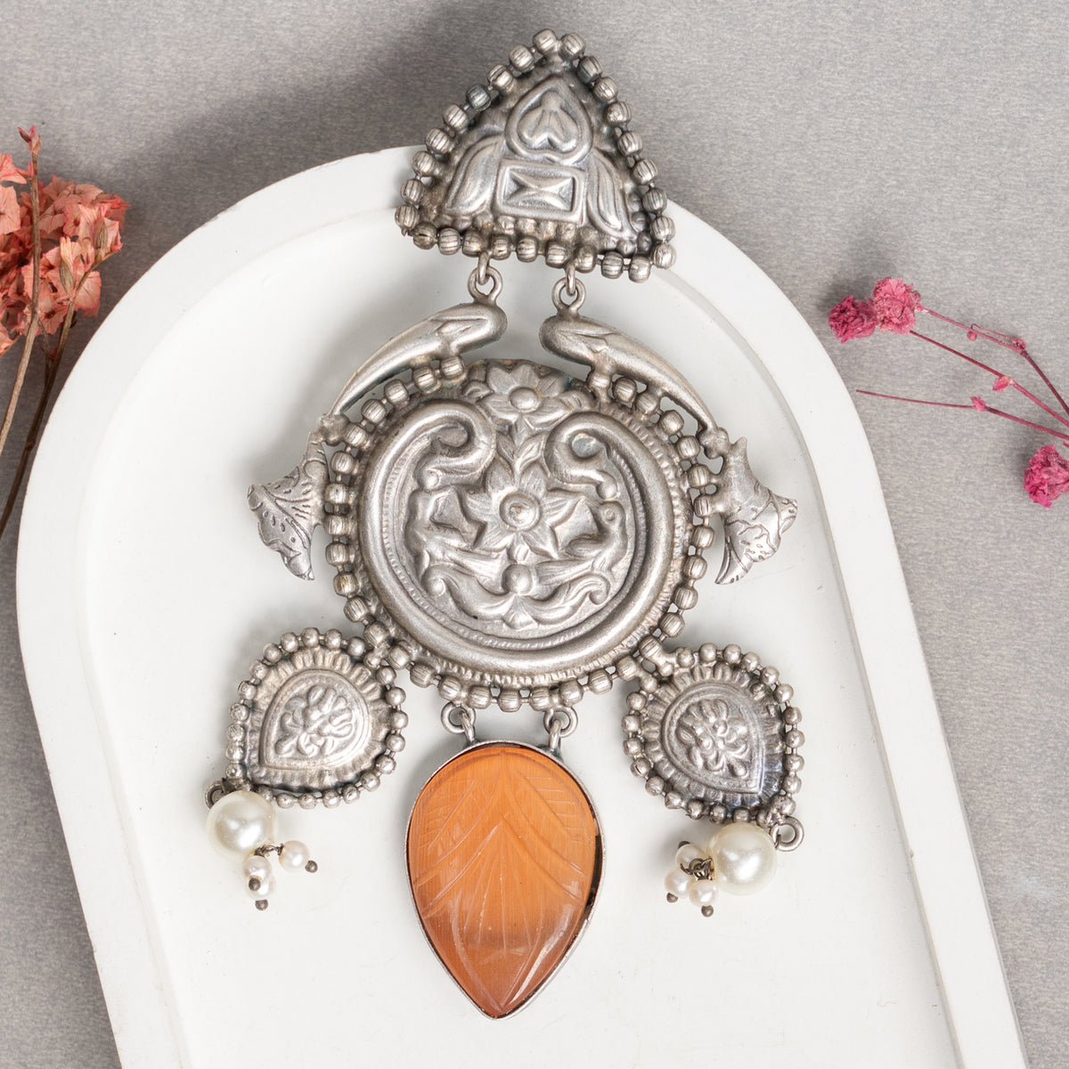 BHAVYA FAUX SILVER RAW AND RUSTIC HANDMADE CARVING STONE EARRINGS/JHUMKAS ER737