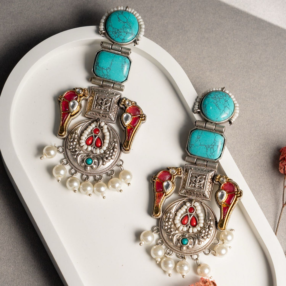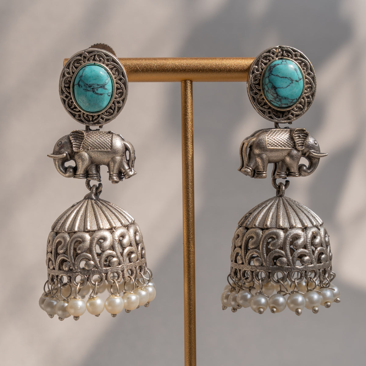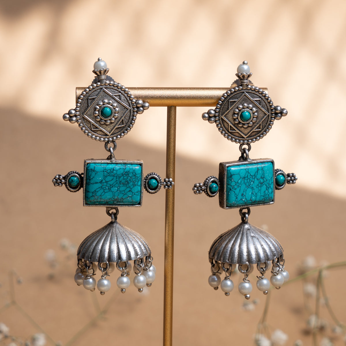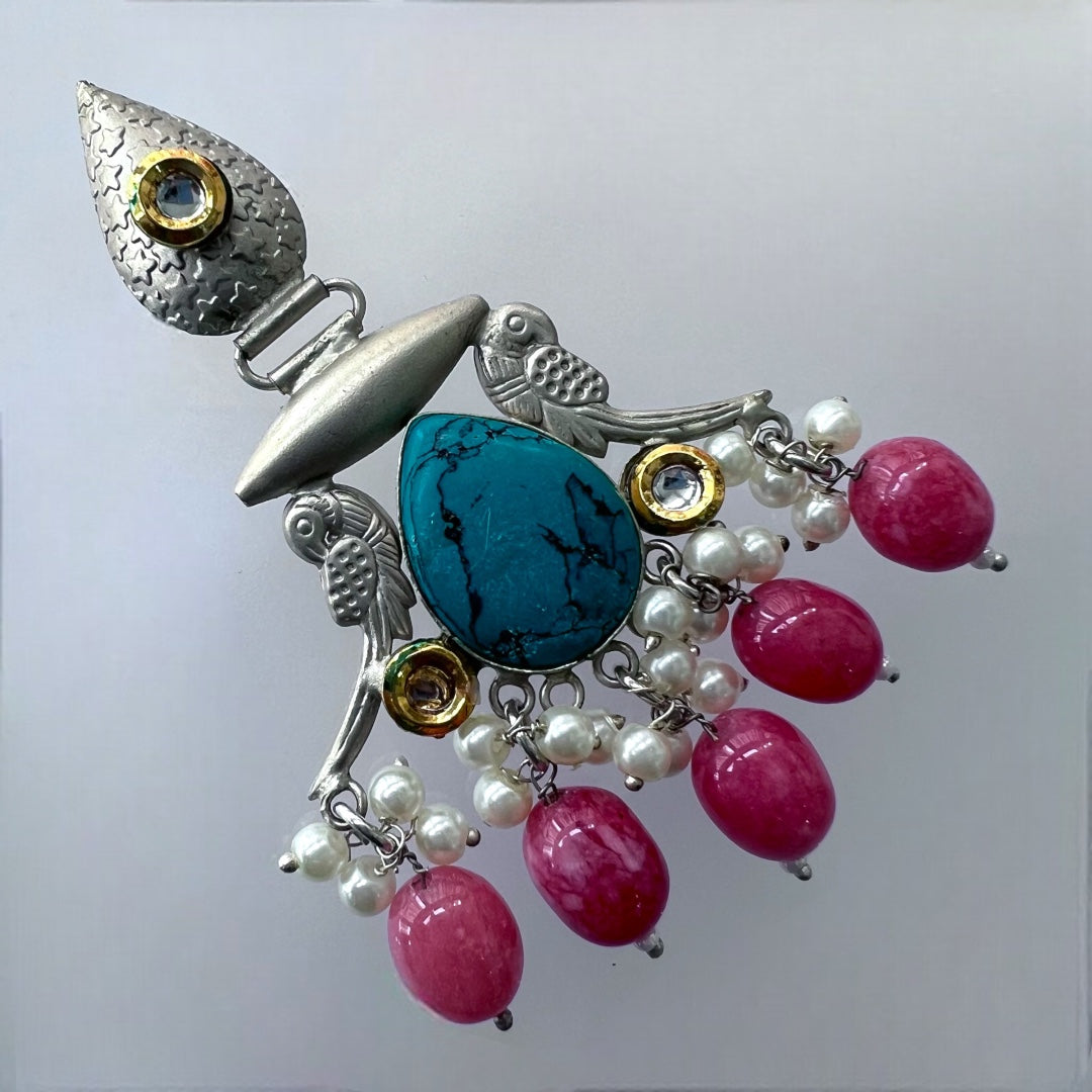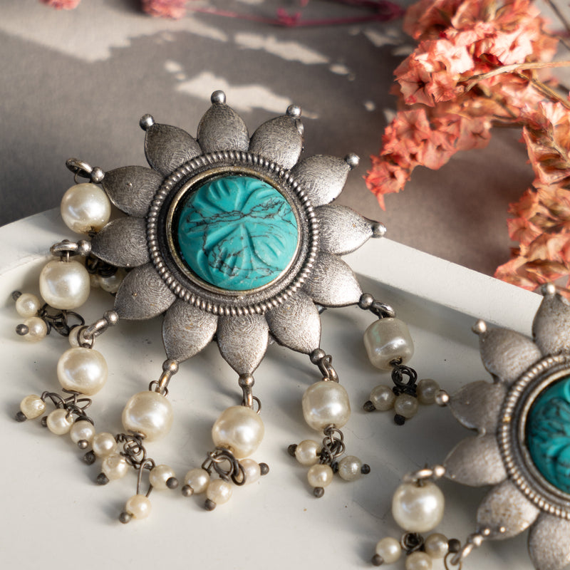 AURELIA FAUX SILVER ANTIQUE SEMI HANDMADE MONALISA STONE EARRINGS/JHUMKAS ER774