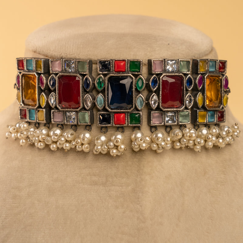 ZOEY HANDMADE MONALISA STONE AND PEARL CHOKER WITH EARRINGS CH501