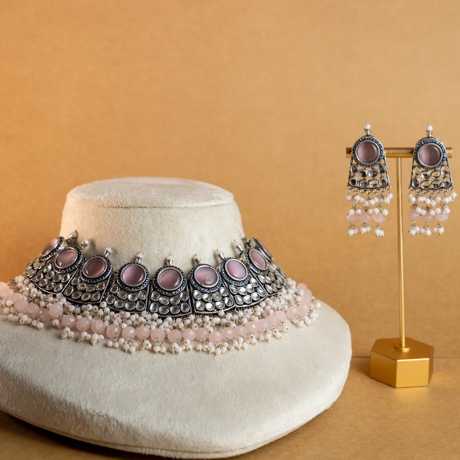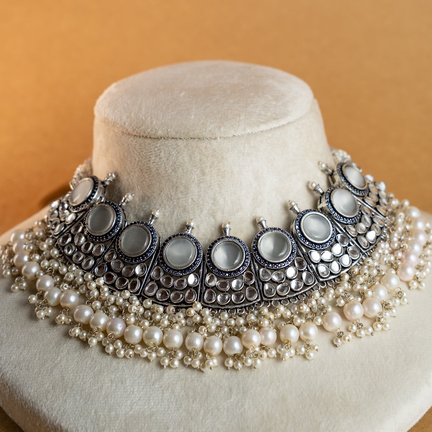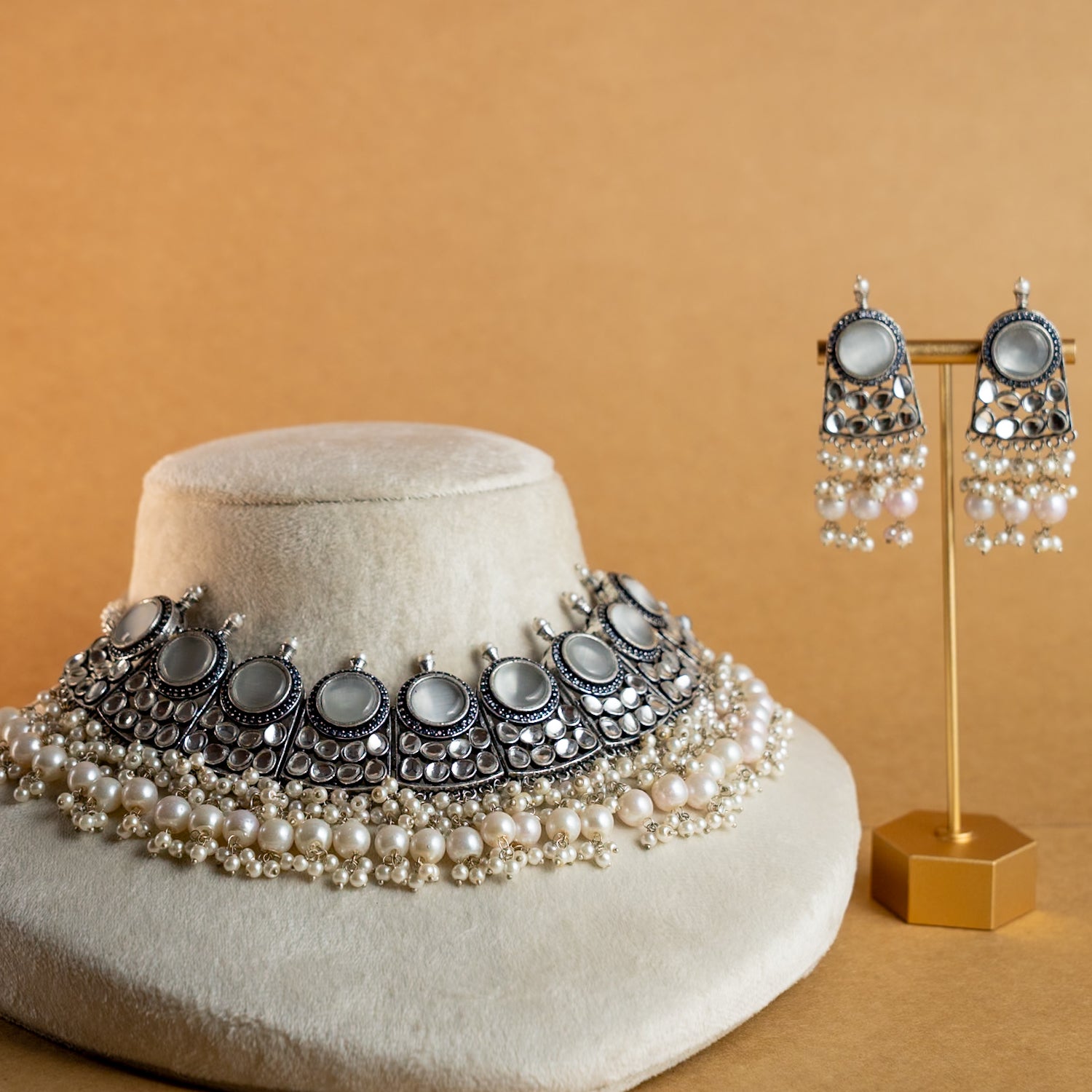 Experience the refined charm of the NILASHA Semi Handmade Monalisa Stones Neckpiece paired with matching earrings. Expertly crafted with attention to detail, each element is chosen to reflect elegant sophistication. This exquisite set showcases superior craftsmanship and classic design, ideal for those who appreciate high-quality, timeless jewelry.