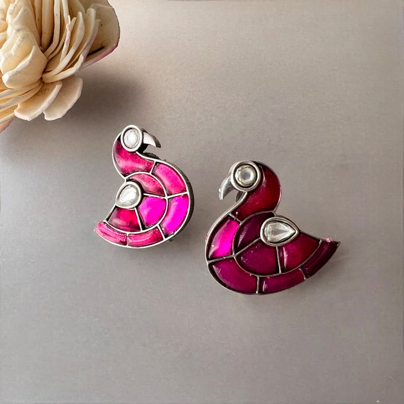PEACOCK FLORAL FEATHER SILVER LOOK ALIKE SEMI HANDMADE STUDS ER520