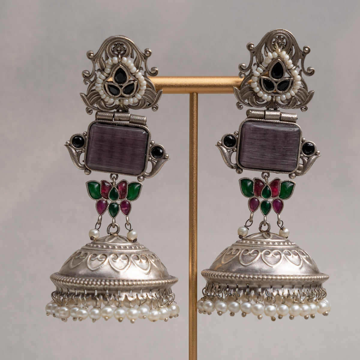 KASHVI BIJOUX PREMIUM FAUX SILVER RAW AND RUSTIC HANDMADE MONALISA STONE EARRINGS/JHUMKAS ER738