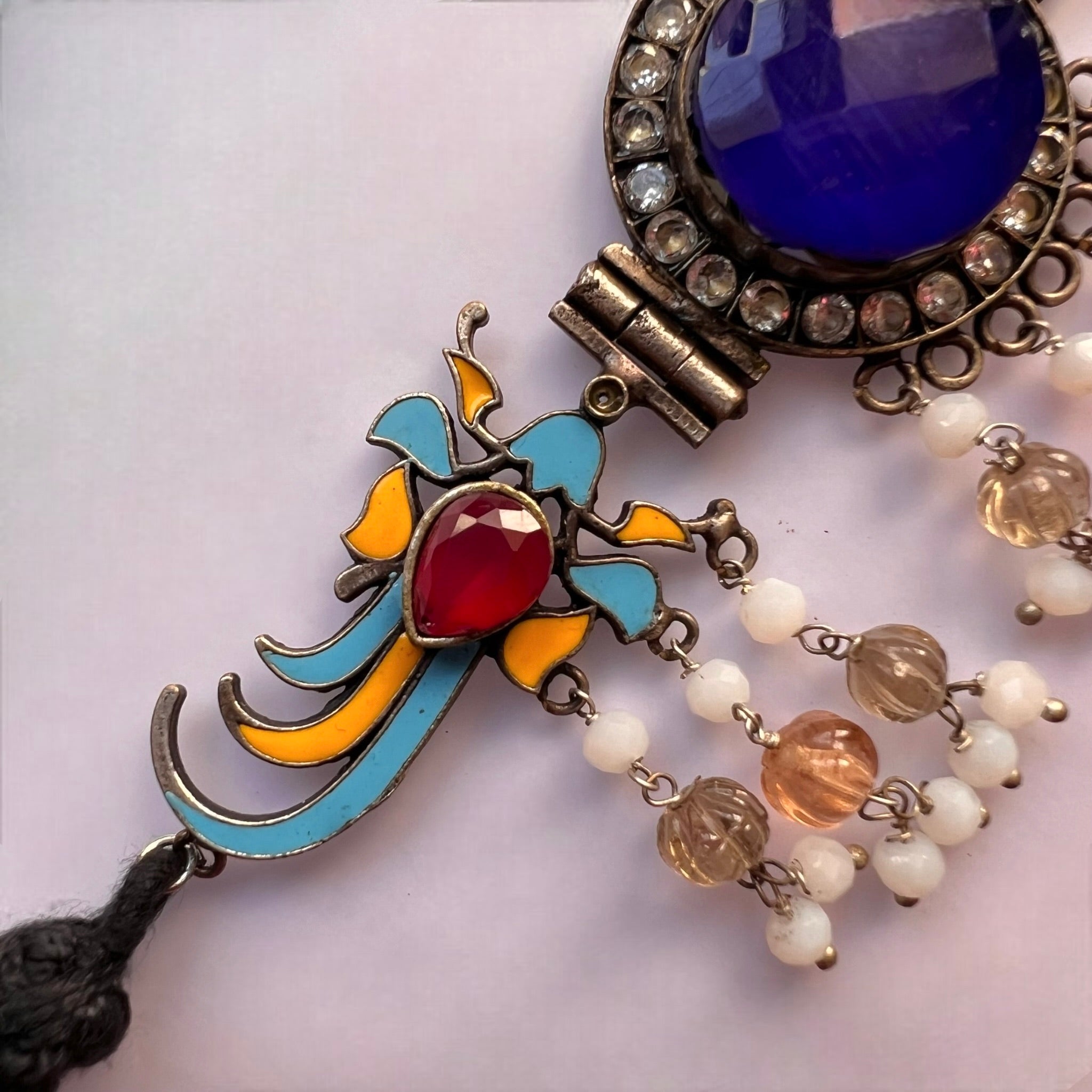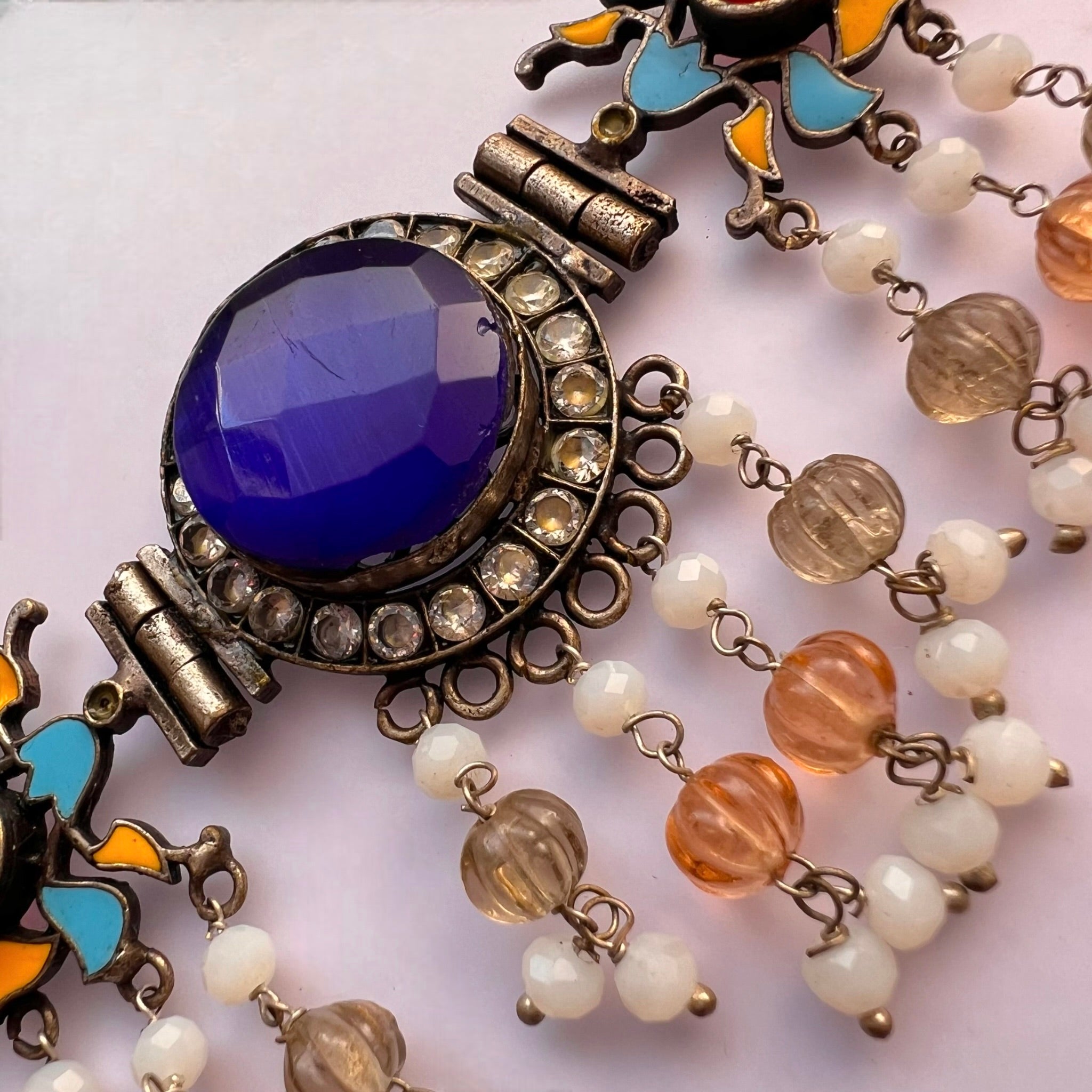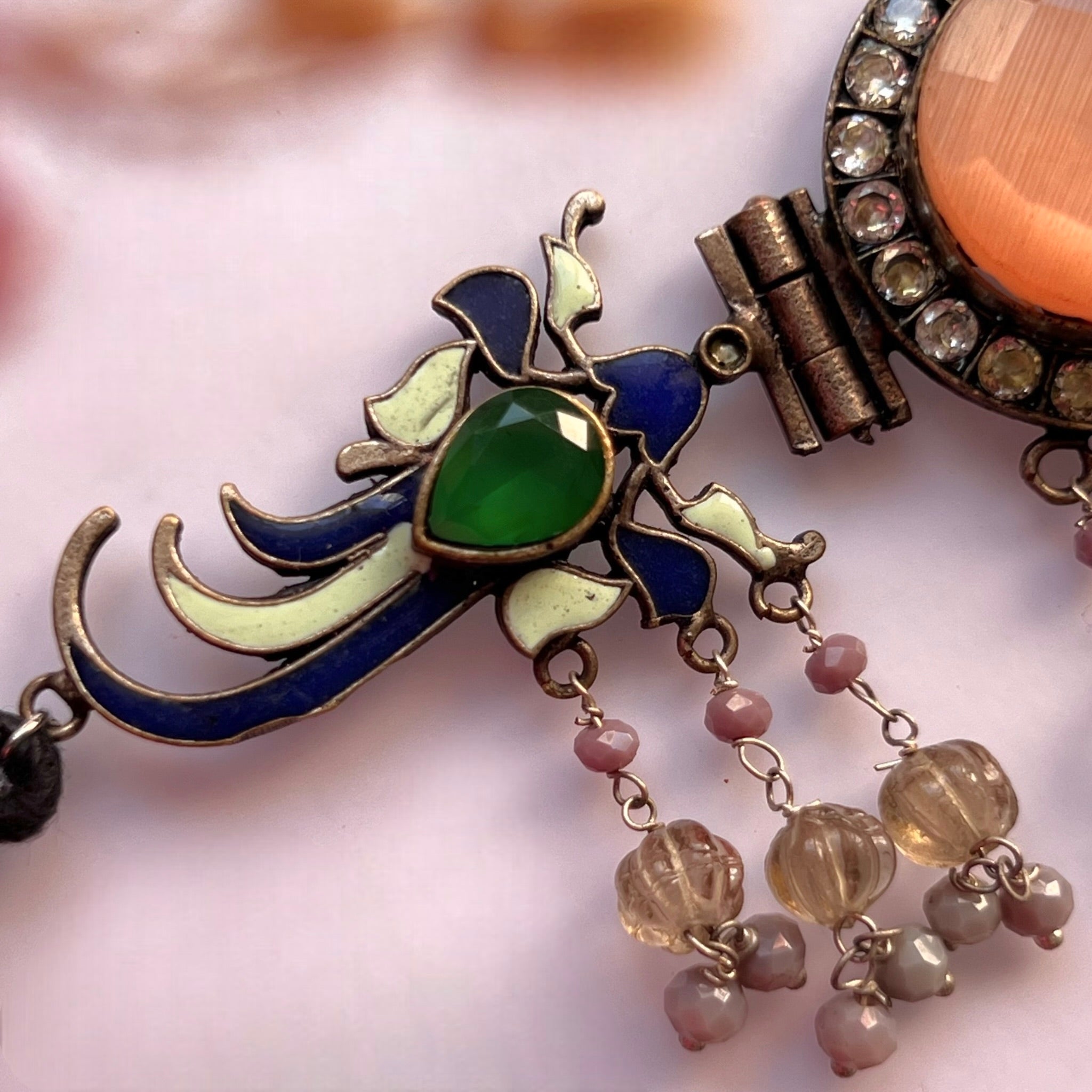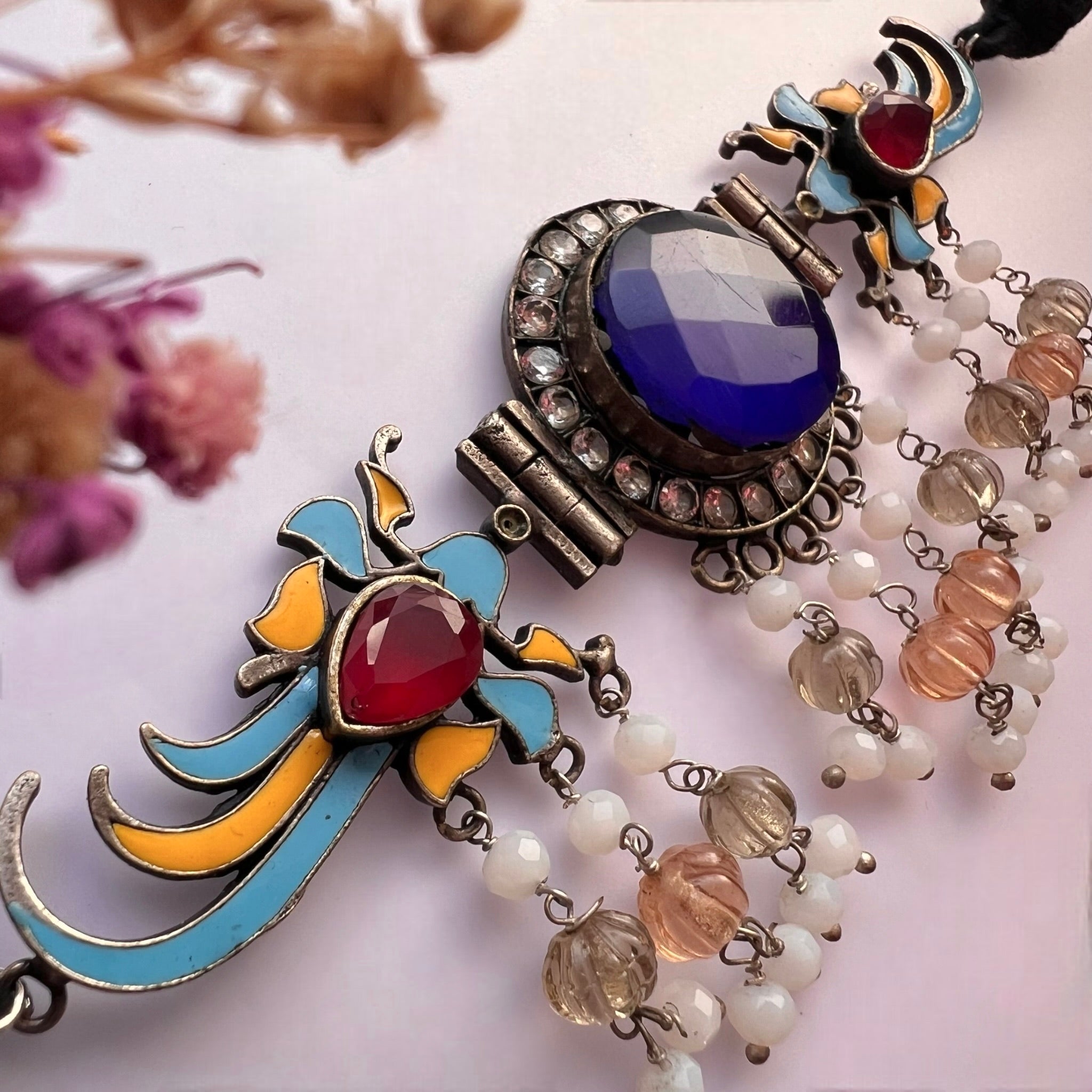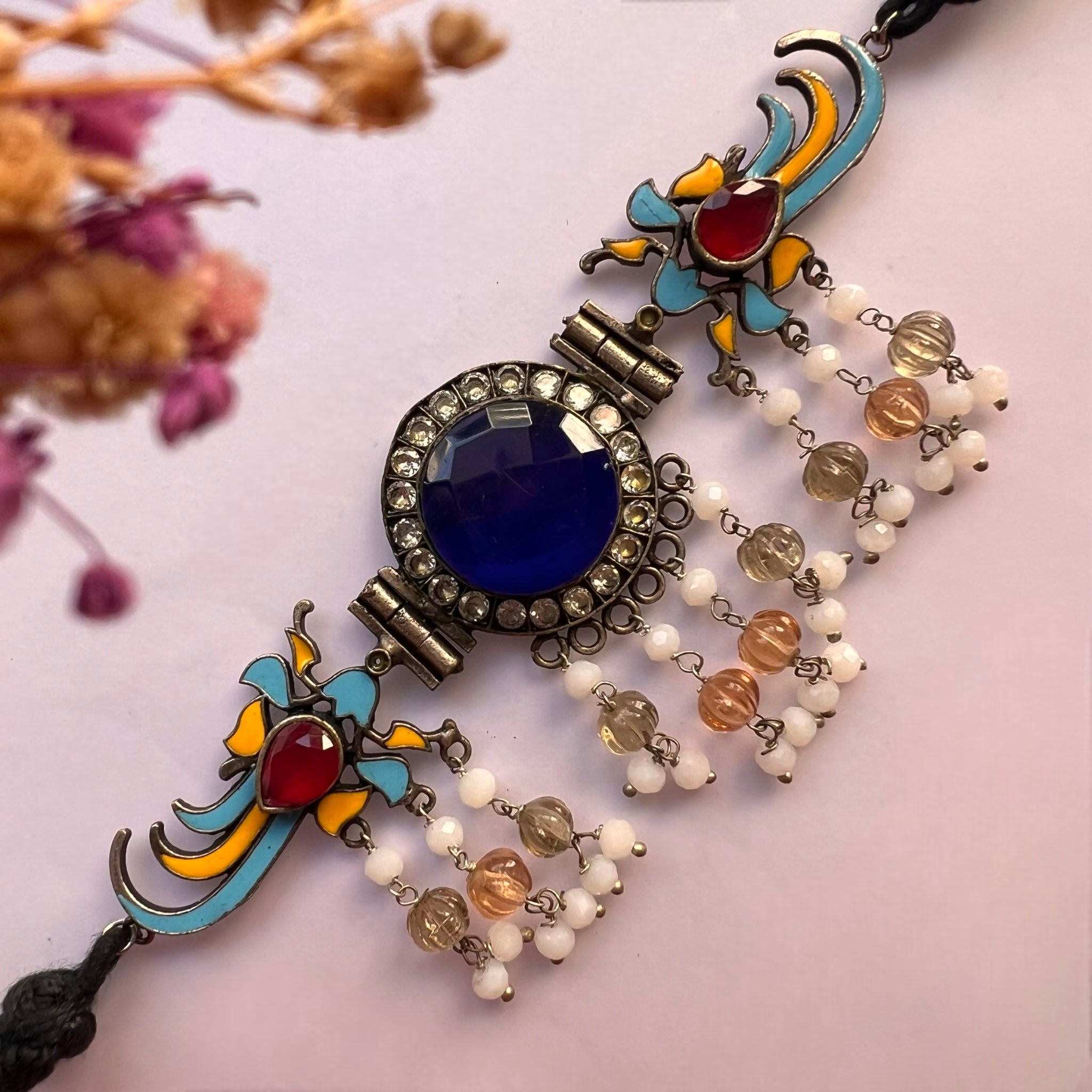 Experience the flawless combination of classic techniques and contemporary touches with MIRA FAUX SILVER SEMI HANDMADE RUSTIC FINISH CHOKER CH490. Skillfully crafted from high-quality Brass, adorned with a delicately crafted Hasli featuring premium brass, this stunning necklace highlights the timeless elegance of Brass and organic gemstones, enhanced by sleek modern elements.