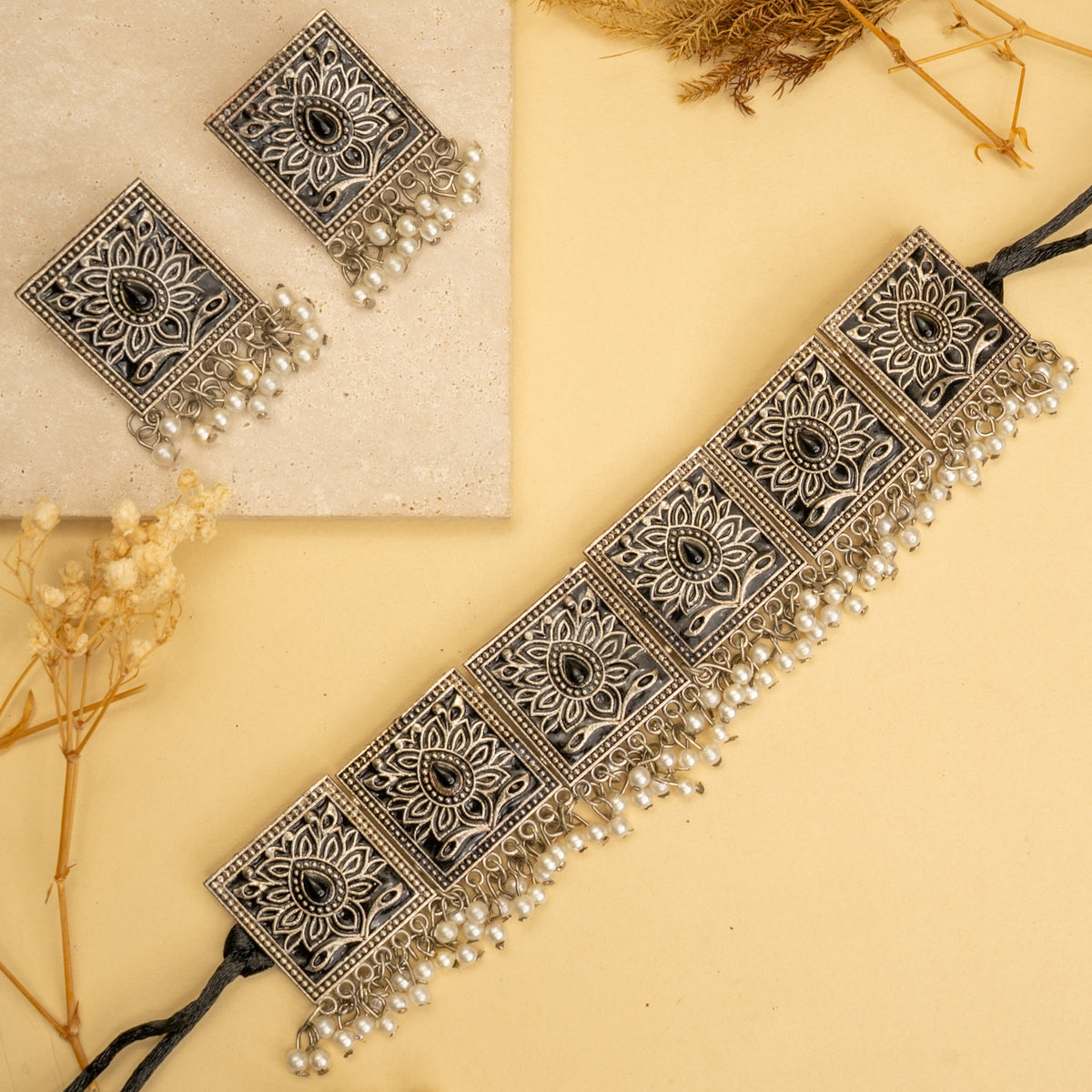 RELATA SILVER LOOK ALIKE SEMI HANDMADE RUSTIC CHOKER WITH EARRINGS CH311