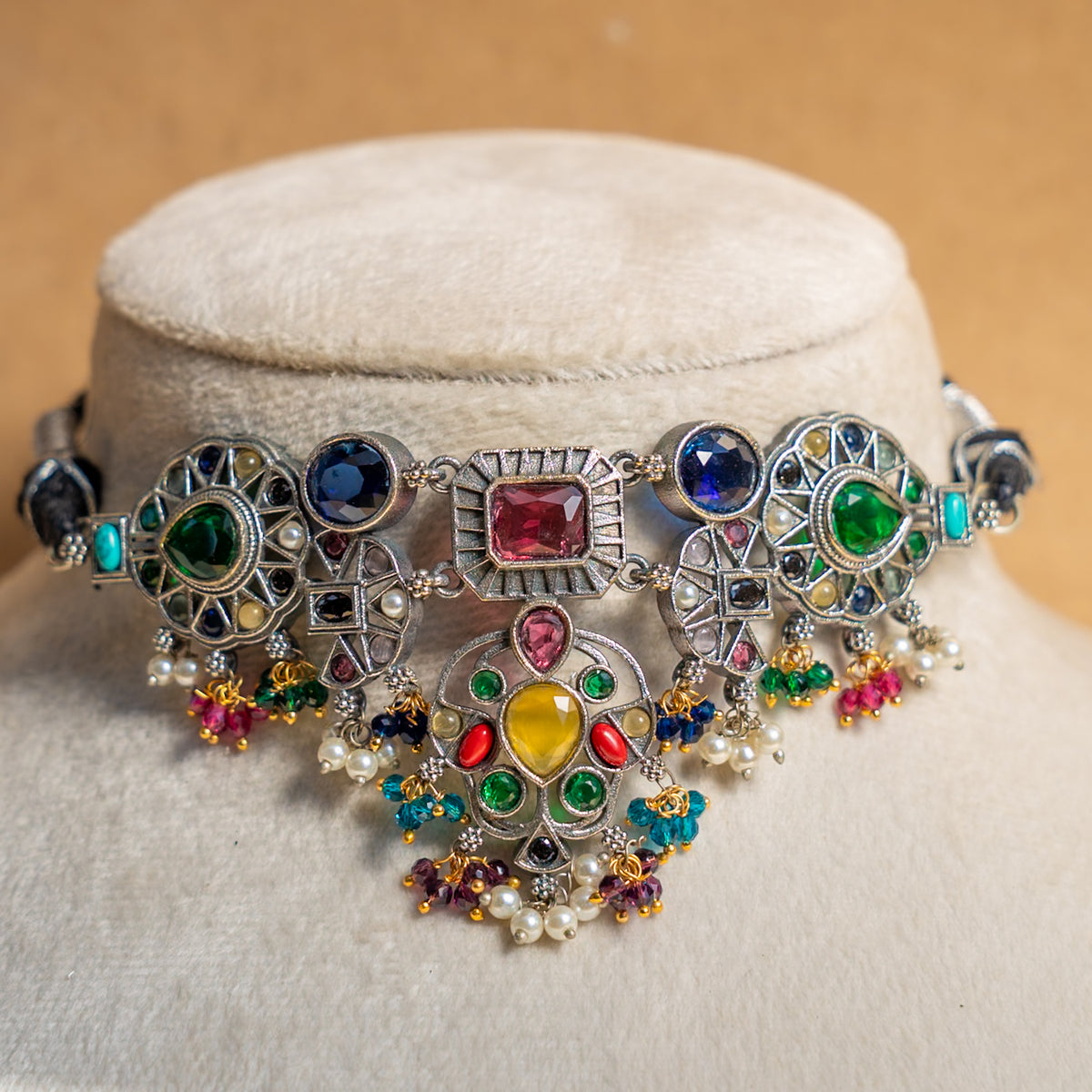 LUNA HANDMADE HANDPAINTED SILVER LOOK ALIKE RUSTIC AND ANTIQUE CHOKER WITH EARRINGS CH463.