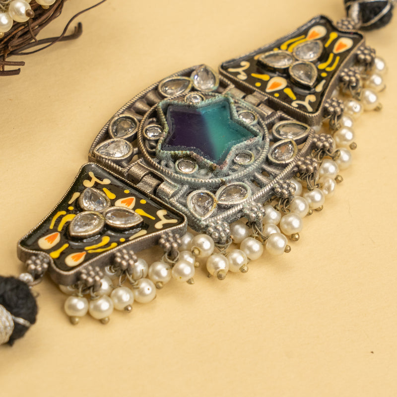 AZARI BIJOUX PREMIUM OXIDIZED TEMPLE SEMI HANDMADE CHOKER WITH EARRINGS CH462