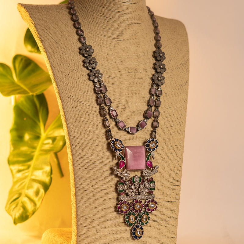 BLOOMY HANDMADE RAW AND RUSTIC FAUX SILVER ANTIQUE MALA WITH EARRINGS ML190
