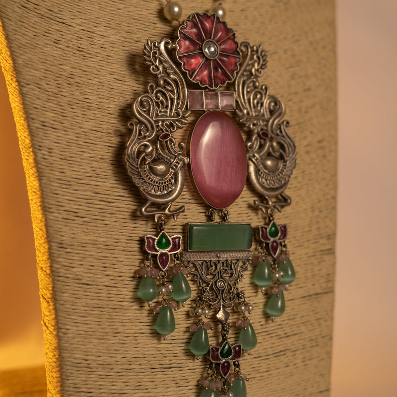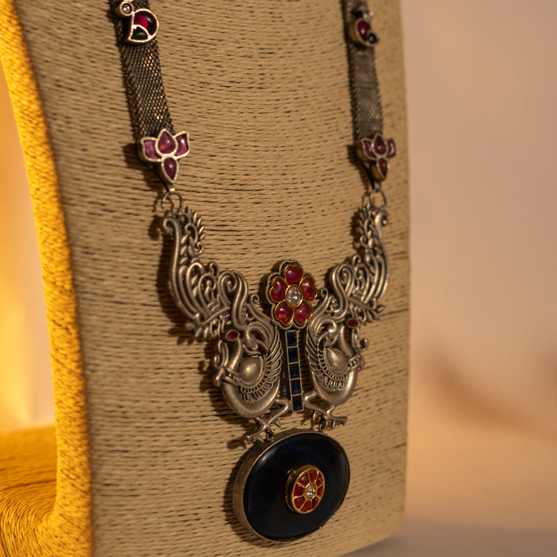 PETAL GRACE HANDMADE RAW AND RUSTIC SILVER LOOK ALIKE ANTIQUE DUAL TONE HANDMADE MALA WITH EARRINGS ML179