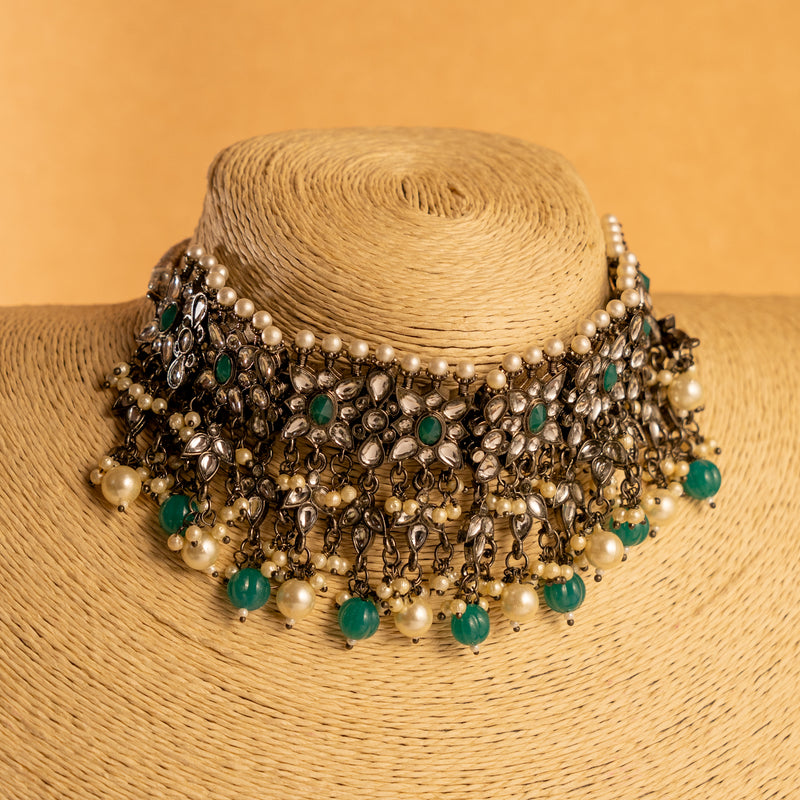 SARAH FAUX KUNDAN SEMI HANDMADE NECKLACE WITH EARRING AND TIKKA NL235