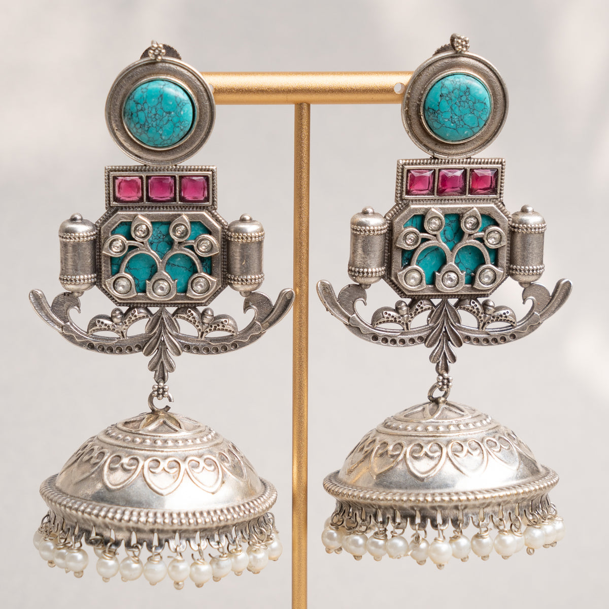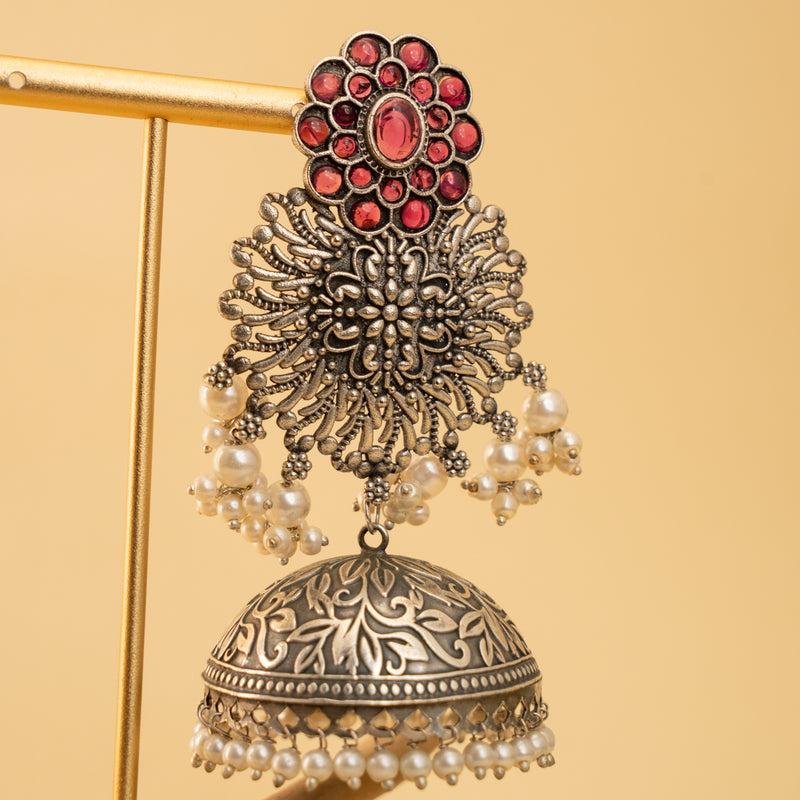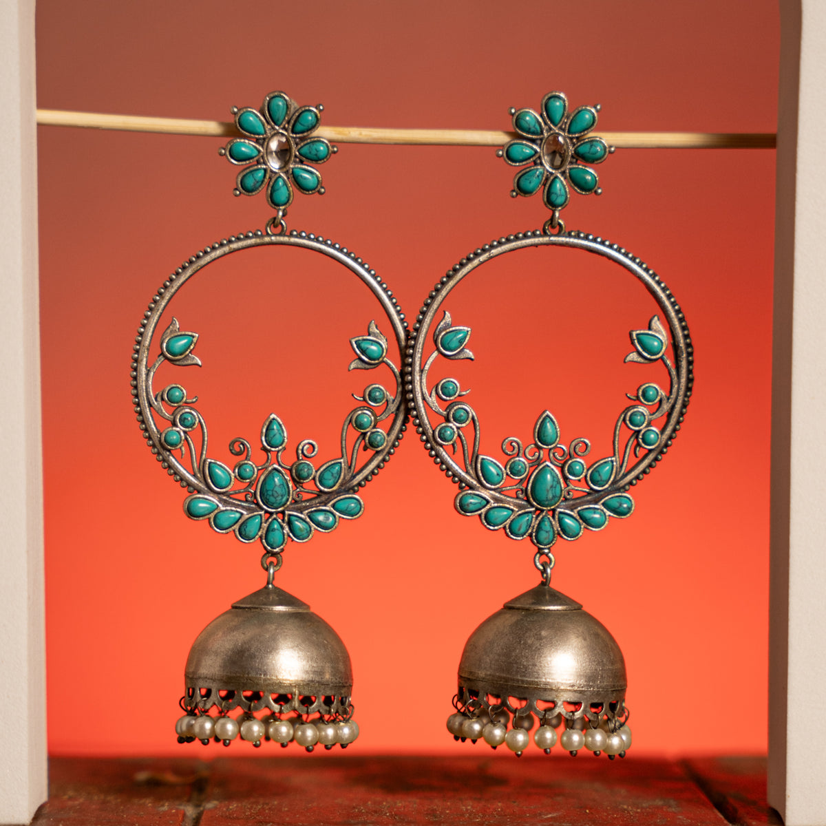 BINAL BIJOUX PREMIUM FAUX SILVER ANTIQUE SEMI HANDMADE EARRINGS/JHUMKAS ER745