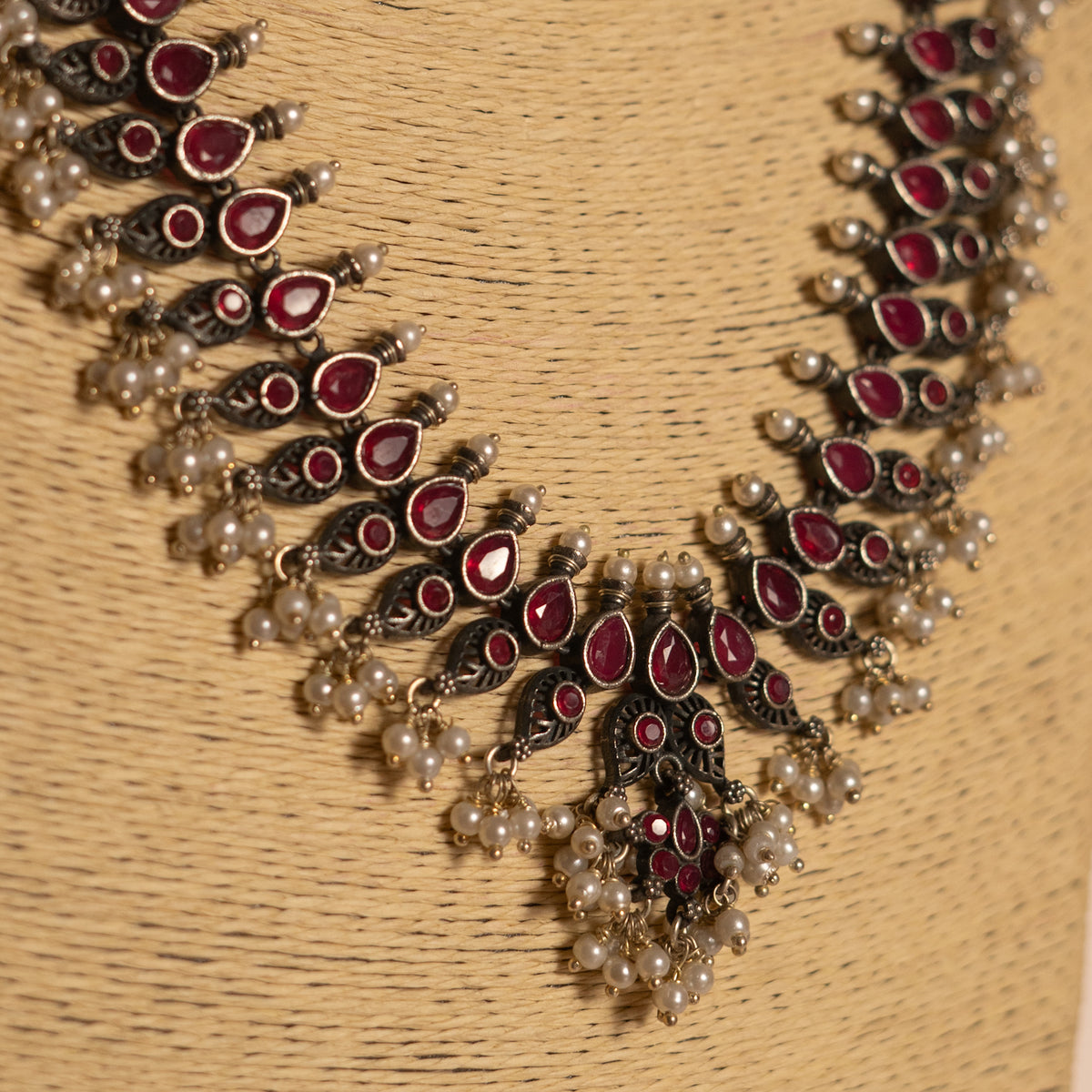 RISHIKA HANDMADE RAW AND RUSTIC FAUX SILVER DUAL TONE ANTIQUE MALA WITH EARRINGS ML189