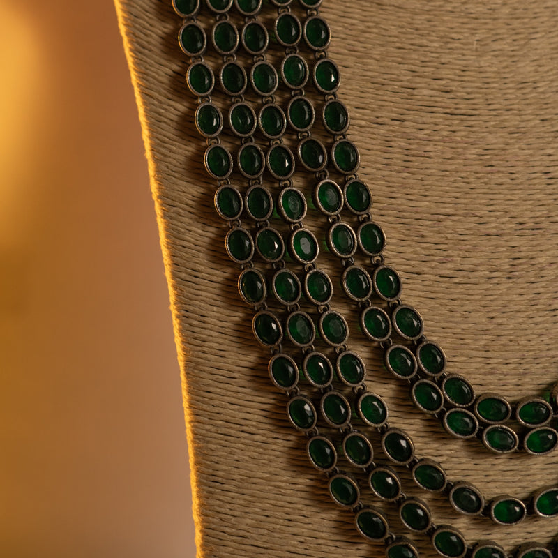 KANIHA FAUX SILVER STONE LAYERED RUSTIC FINISH SEMIHANDE NECKLACE WITH EARRINGS NL142