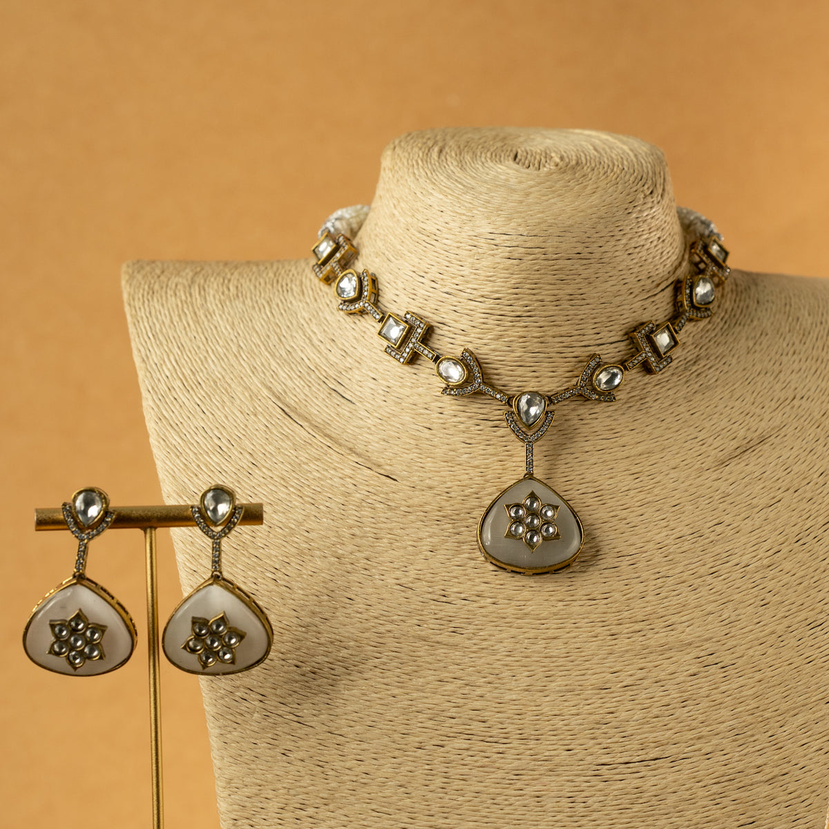 RISHONA DUAL TONED SEMI HANDMADE MONALISA STONES NECKPIECE/NECKLACE WITH EARRINGS NL320