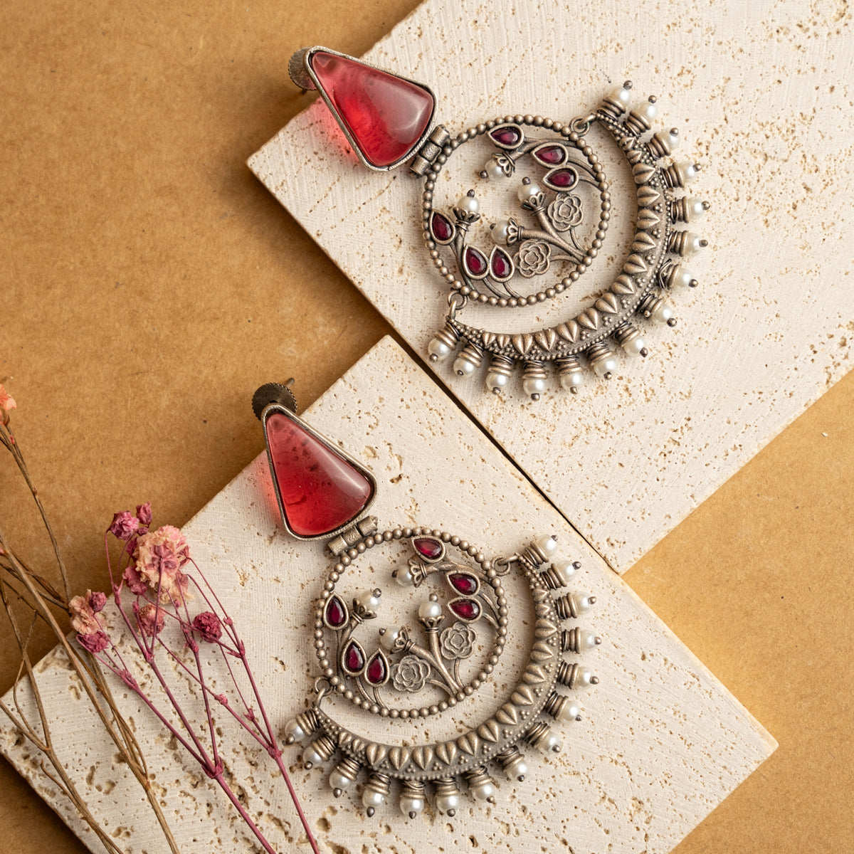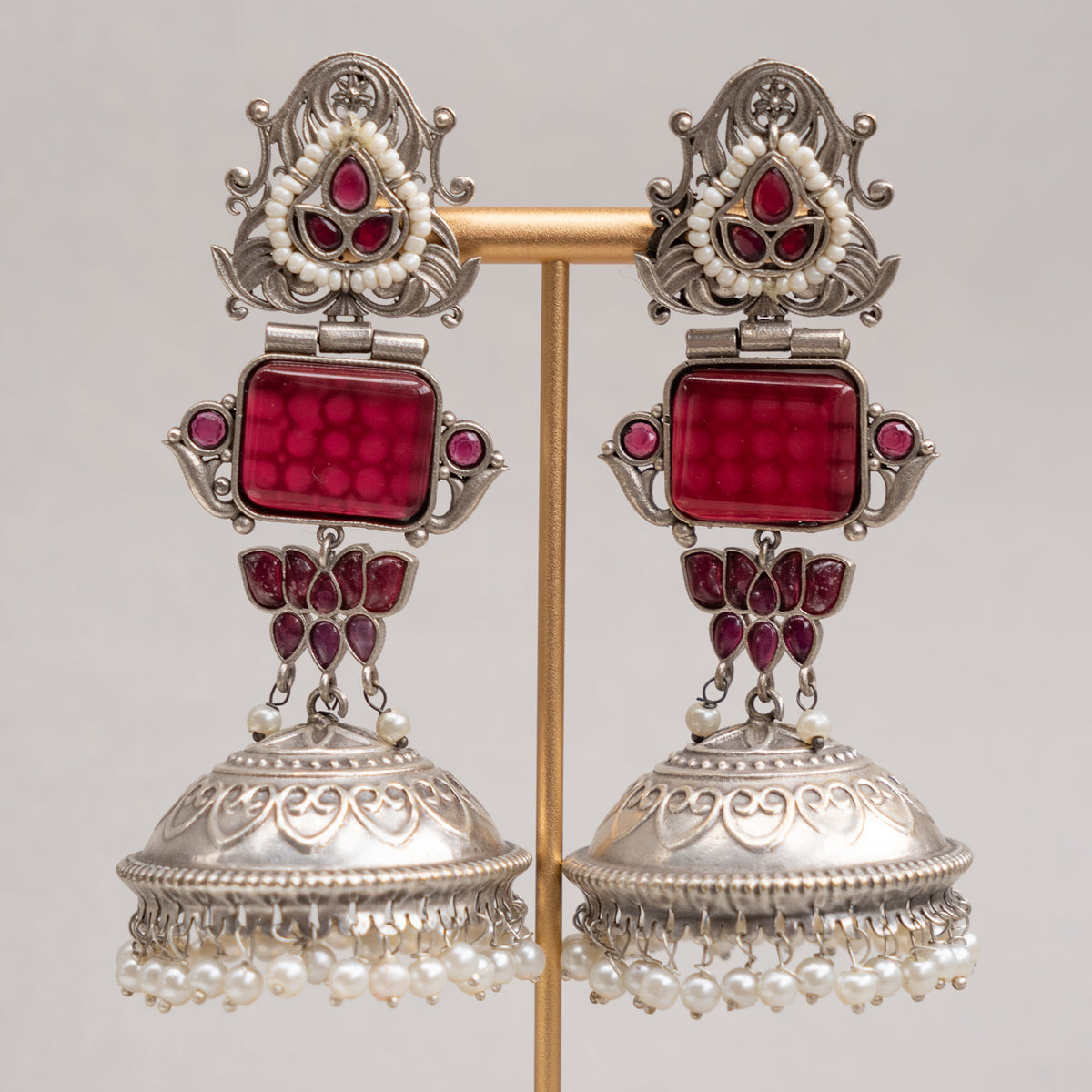 KASHVI BIJOUX PREMIUM FAUX SILVER RAW AND RUSTIC HANDMADE MONALISA STONE EARRINGS/JHUMKAS ER738