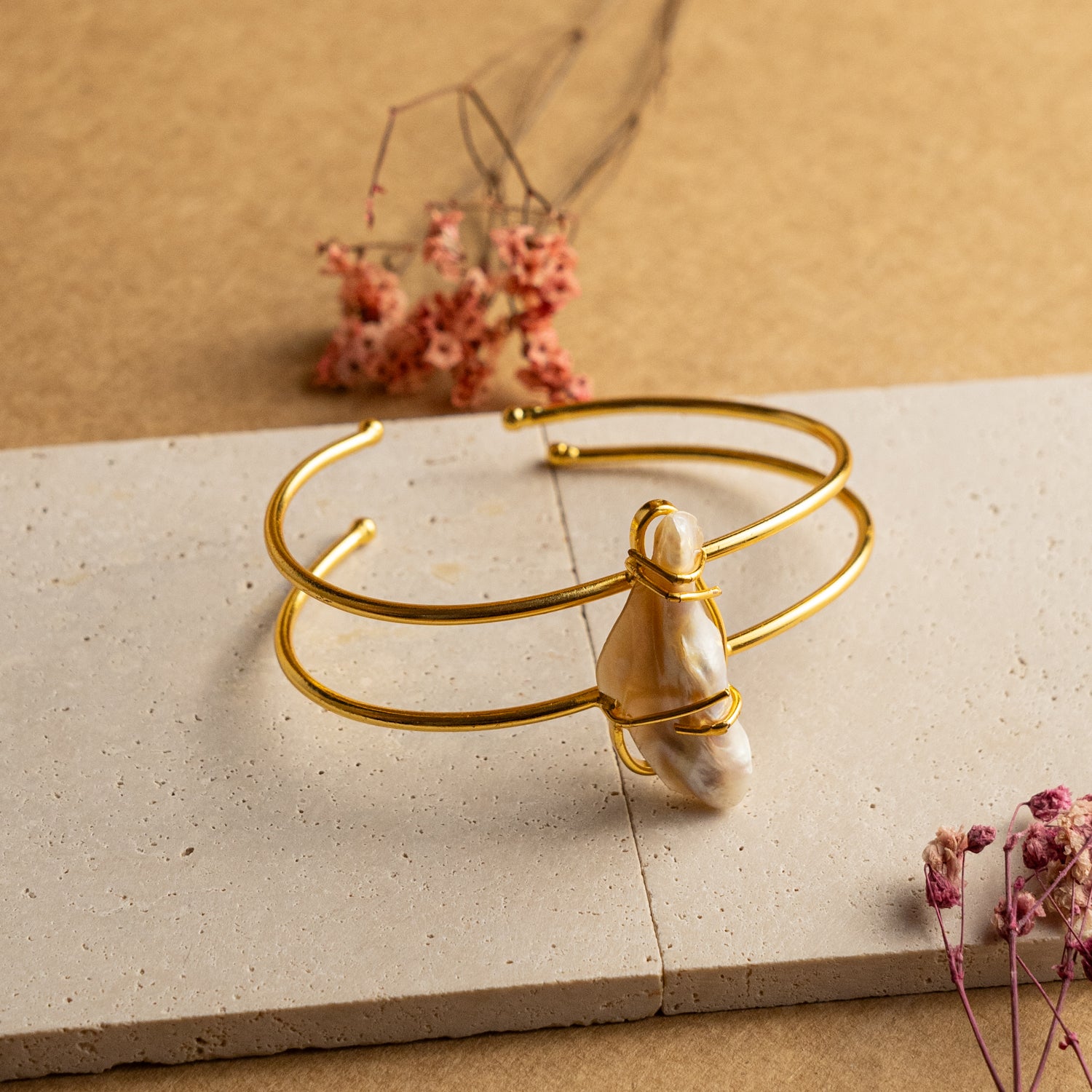 Elevate your style with the sleek refinement and grace of the RINA HAND HAMMERED AND HANDMADE MOP GOLD TONED CLASSIC BRACELETS BR31. Its authentic natural stones bring a beautiful touch of nature to any ensemble, adding a touch of elegance to your look.