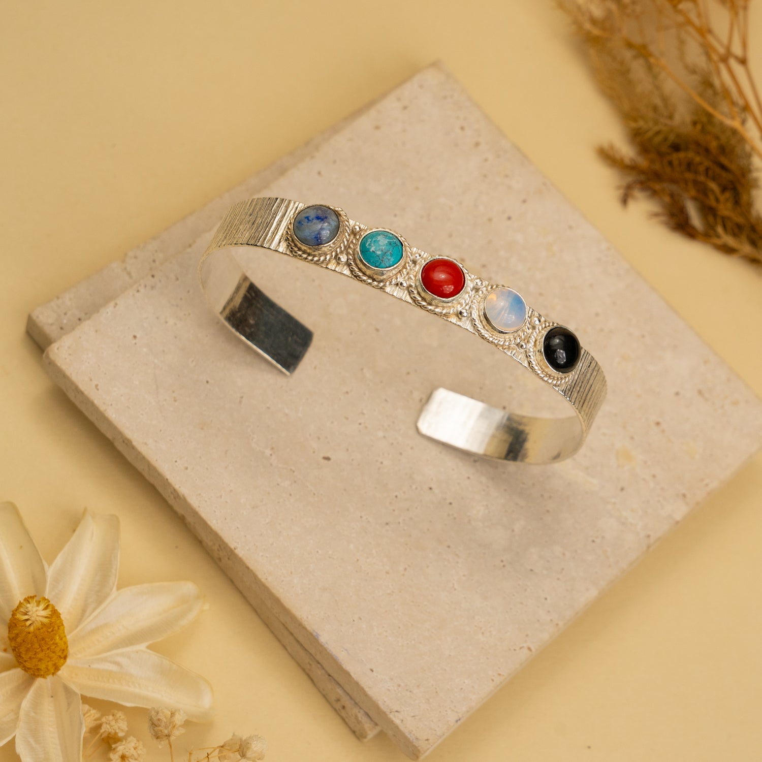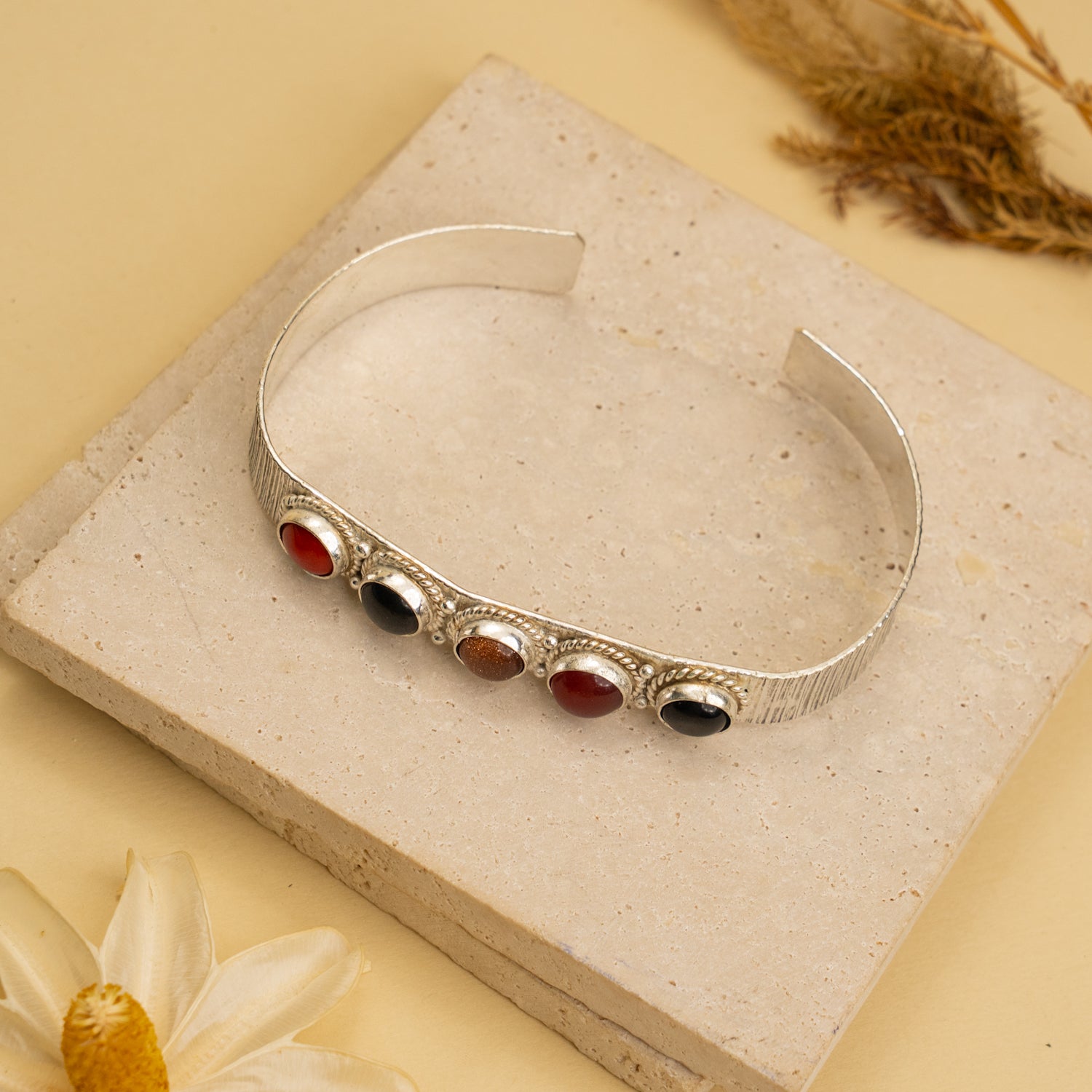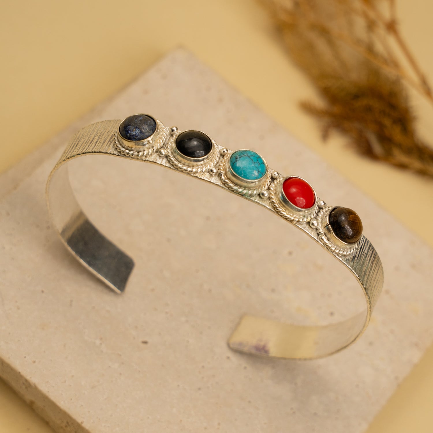 Elevate your style with NIRALYA UNFORMED PREMIUM HAND HAMMERED AND HANDMADE STONE BANGLE CUFF BR11, showcasing a selection of natural stones that bring a refined and cohesive element to any outfit.