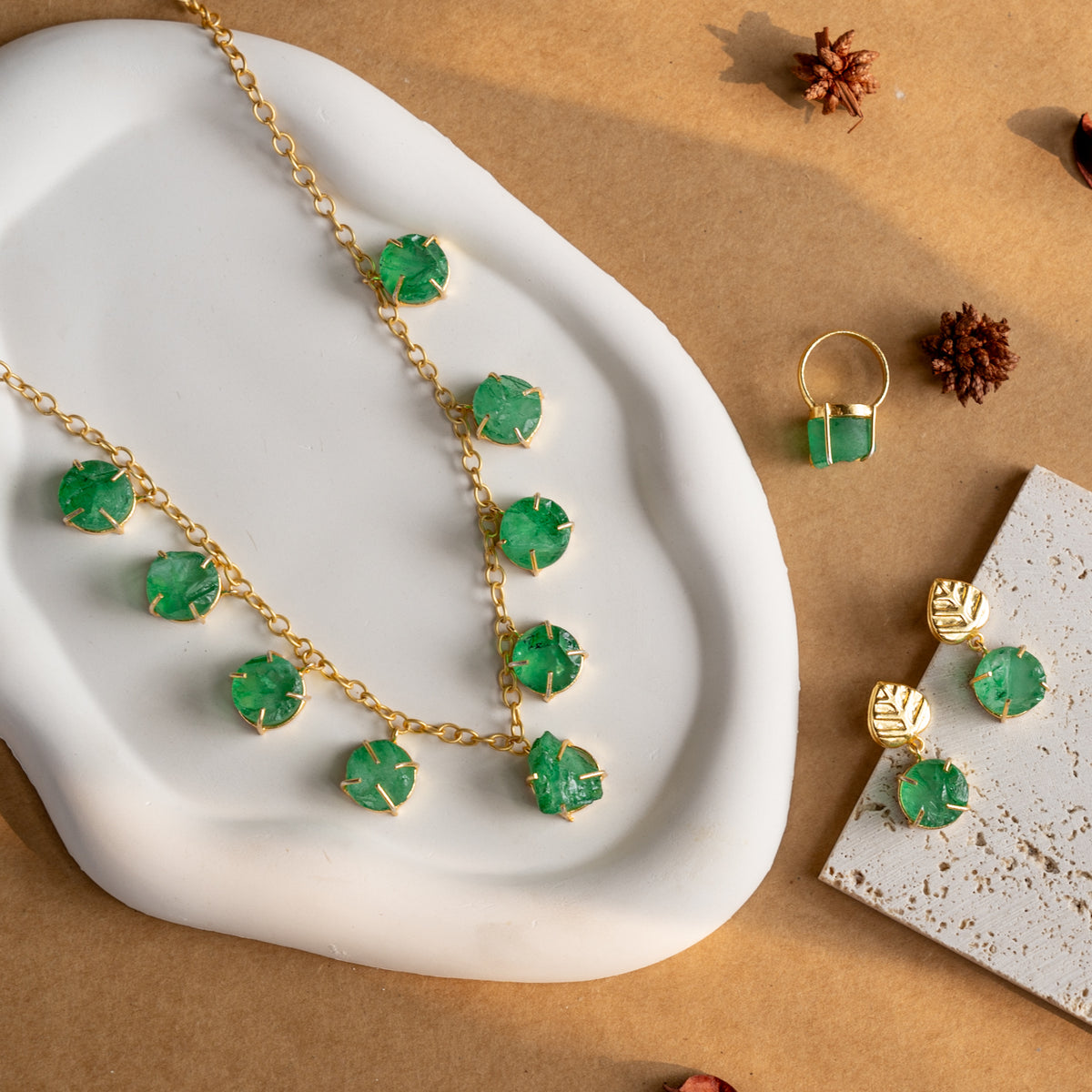 VISHALAYA GOLD TONED RAW STONE HANDMADE HAND HAMMERED NECKLAC EARRINGS WITH RING NL223