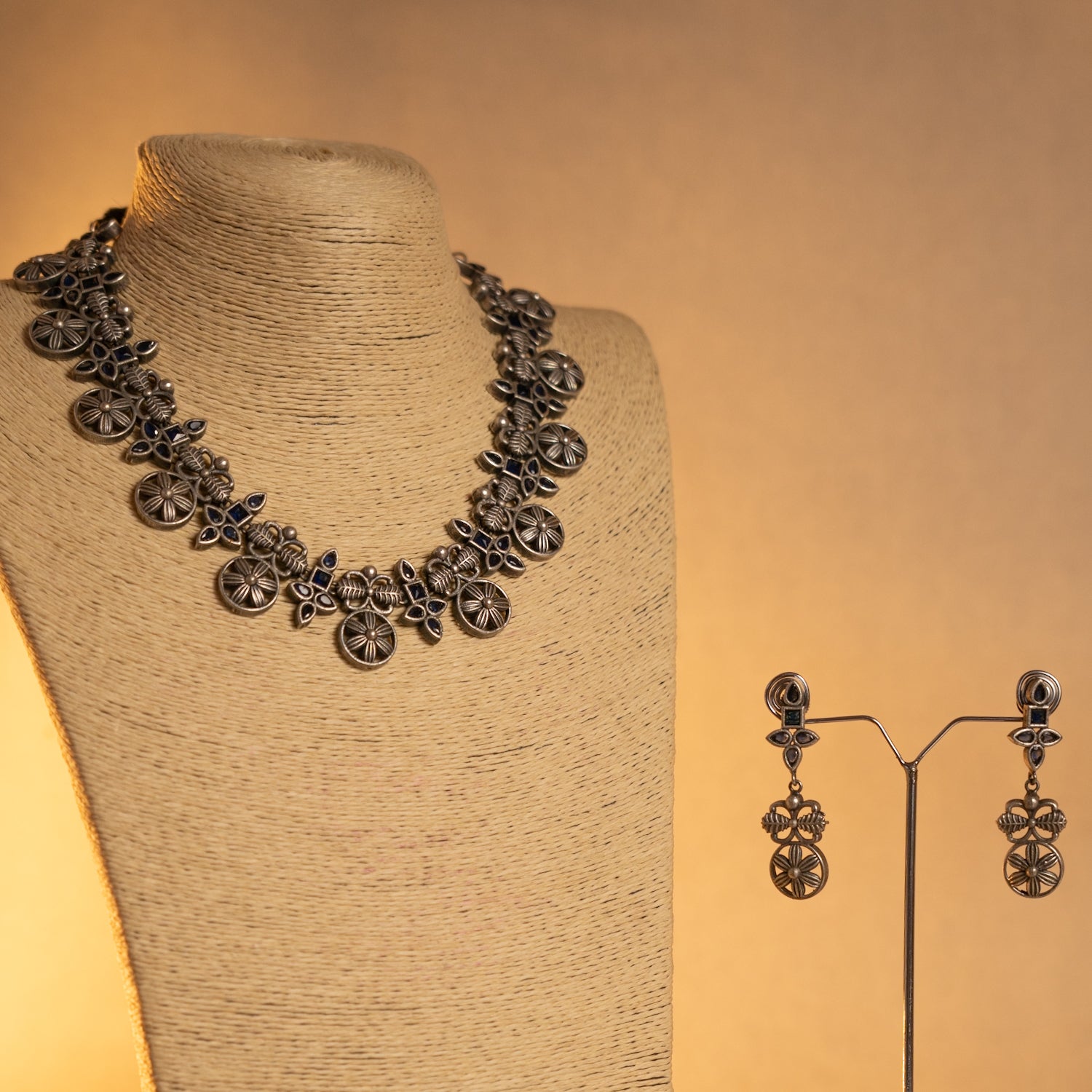 ALICE FAUX SILVER SEMI HANDMADE ANTIQUE NECKPIECE/NECKLACE WITH EARRING NL287