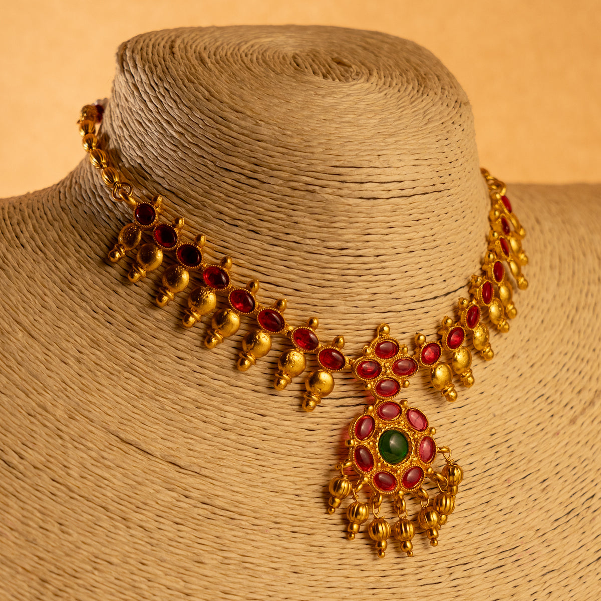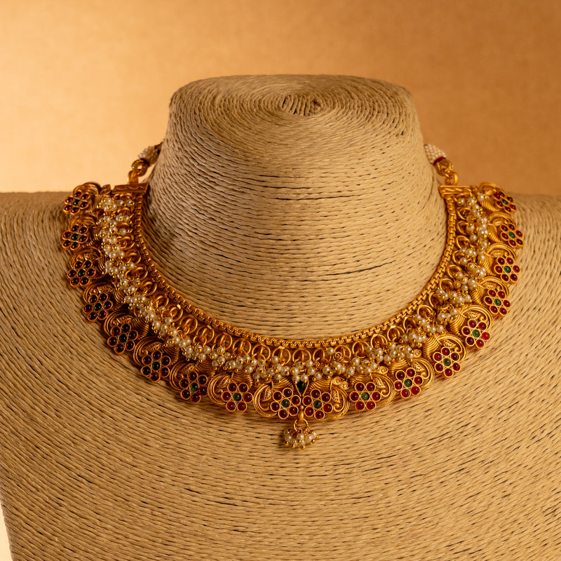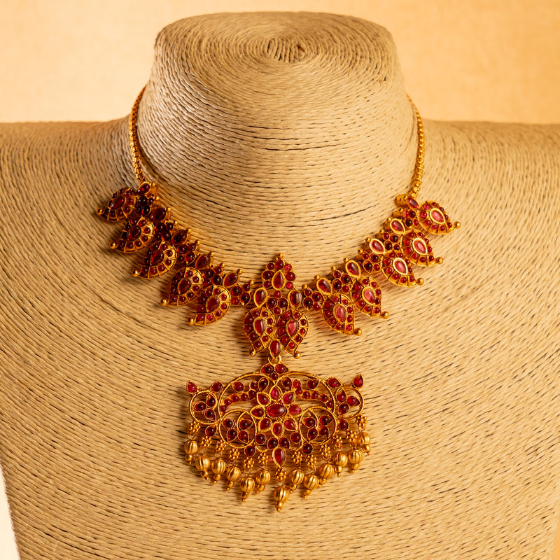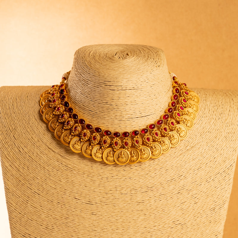 RITHIKA RUBY GOLD TONED ANTIQUE FINISH TEMPLE NECKLACE WITH EARRINGS NL174
