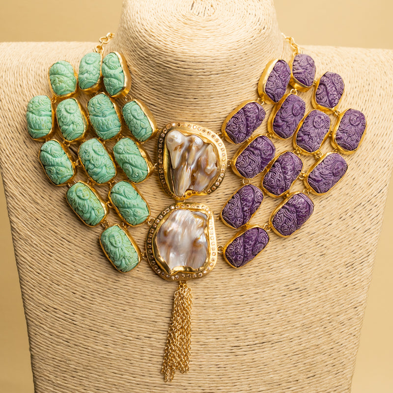 VIVIAN HANDCARVED CORAL MOP ZIRCON PREMIUM EXCLUSIVE HANDMADE STATEMENT CHOKER/NECKPIECE CH310
