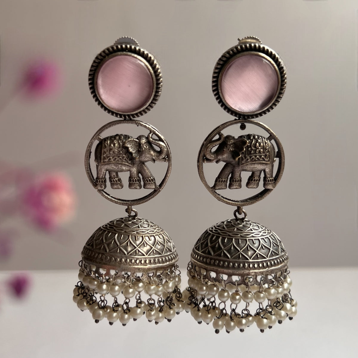 CHARVI FAUX SILVER RAW AND RUSTIC SEMI HANDMADE MONALISA STONE JHUMKAS/ EARRINGS ER654