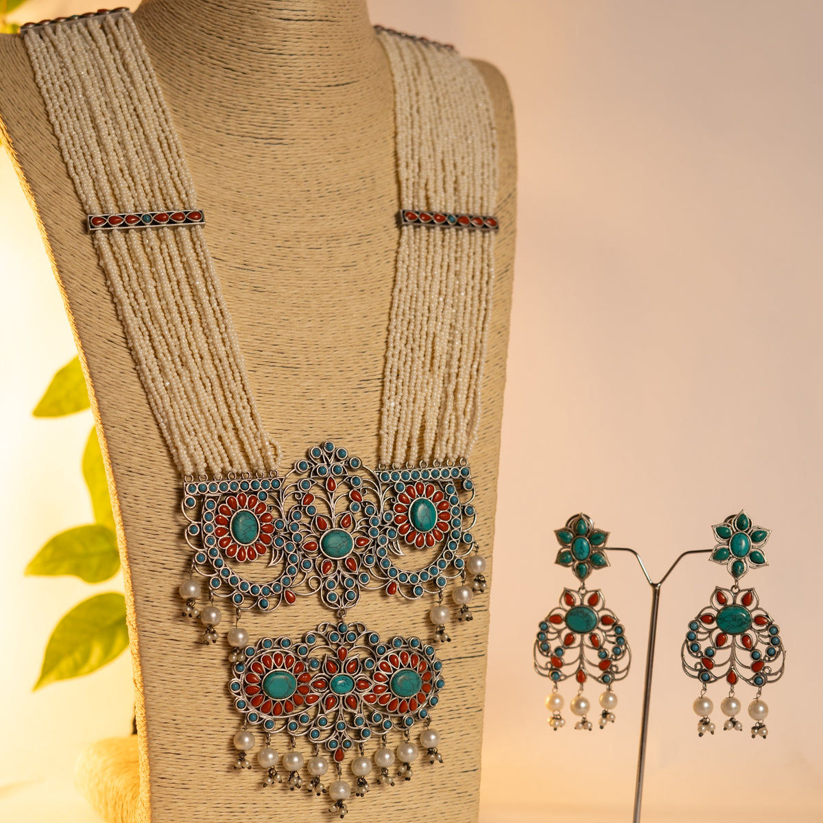AQUA HANDMADE RAW AND RUSTIC MARINA FAUX SILVER ANTIQUE MALA WITH EARRINGS ML183