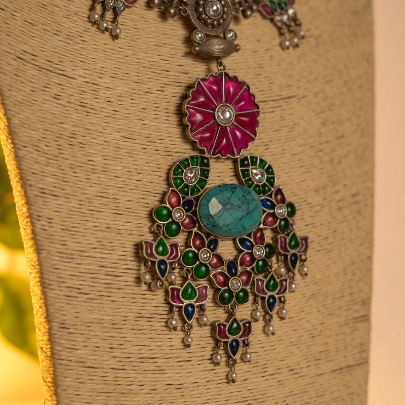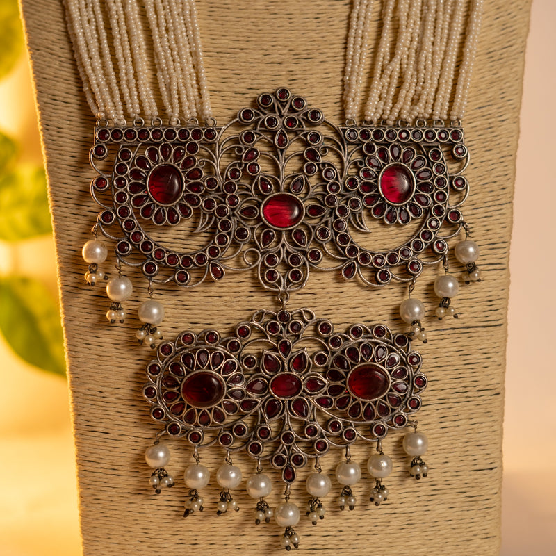 BLOOM HANDMADE RAW AND RUSTIC CLUSTER FAUX SILVER ANTIQUE MALA WITH EARRINGS ML185