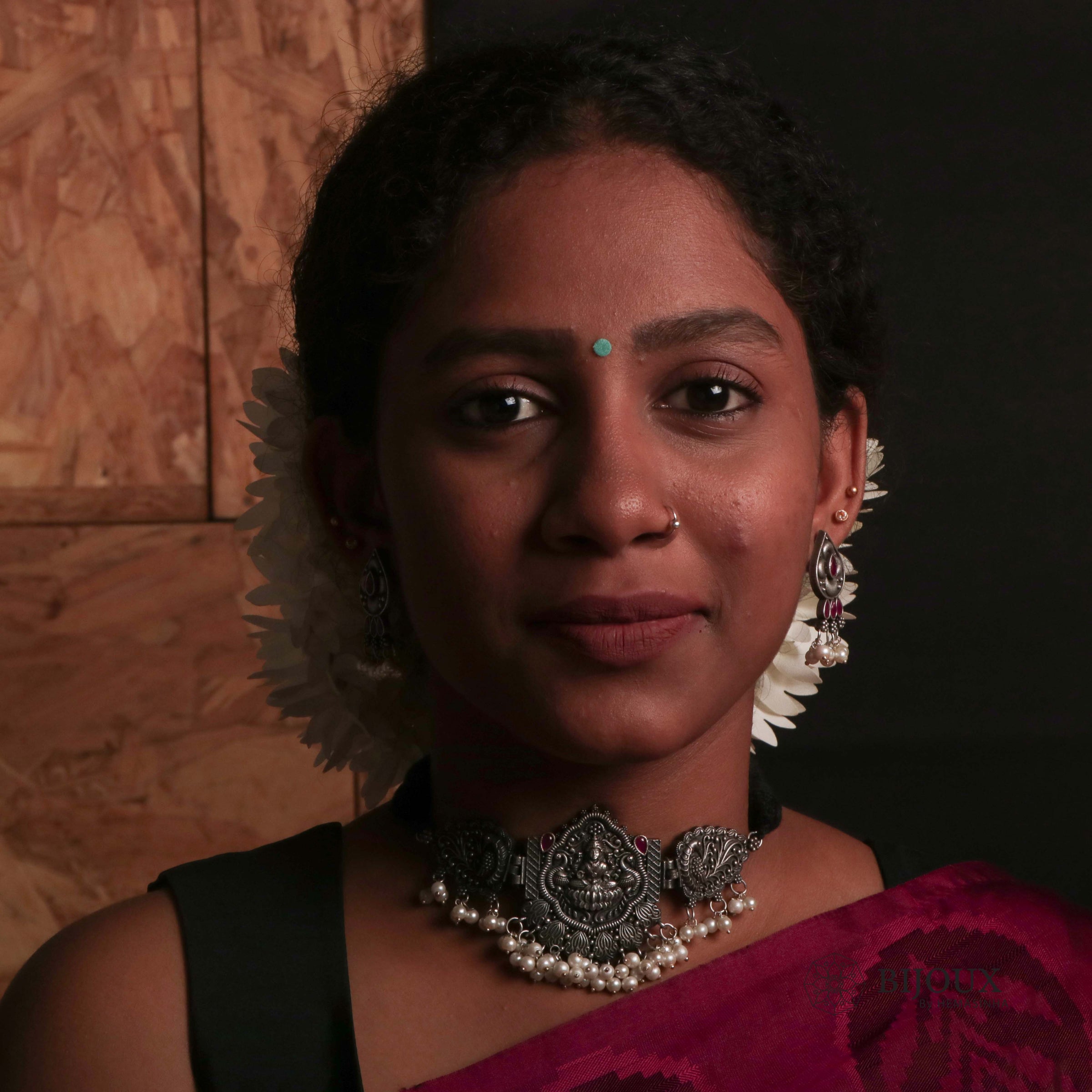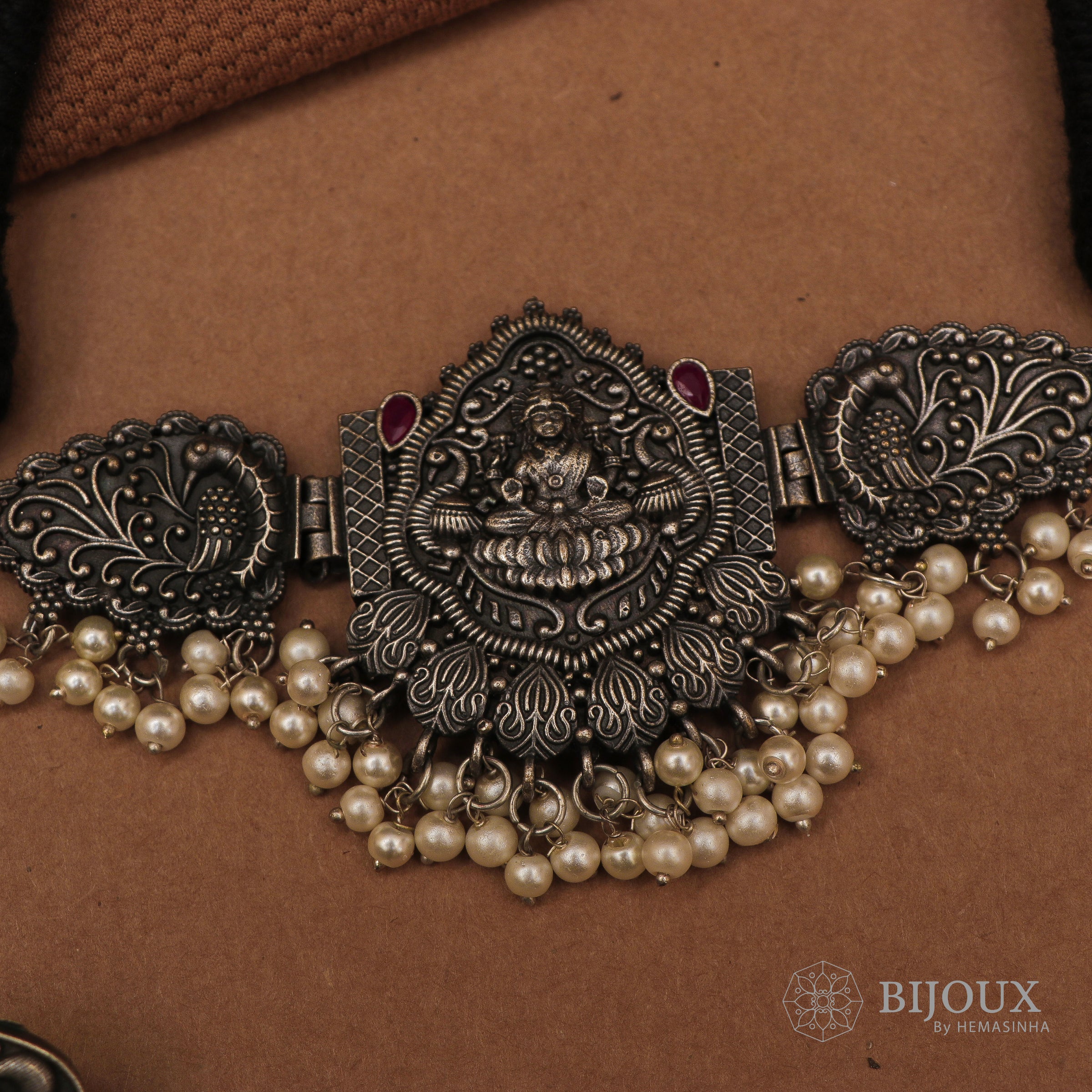 NANDHINI BIJOUX PREMIUM SEMI HANDMADE CHOKER WITH EARRINGS CH66 exudes a timeless elegance, exemplifying impeccable craftsmanship and an exquisite design that enhances any outfit with a hint of classic charm. An essential addition for connoisseurs of fine jewelry and sophisticated style.